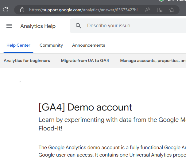 - Go to the Google Analytics 4 demo account page: https://support.google.com/analytics/answer/6367342?hl=en.